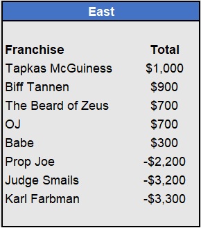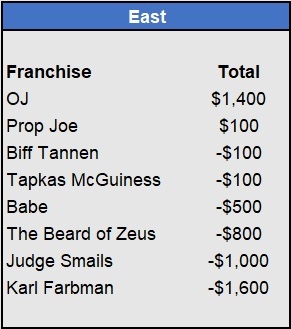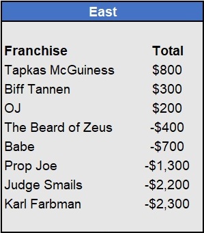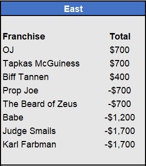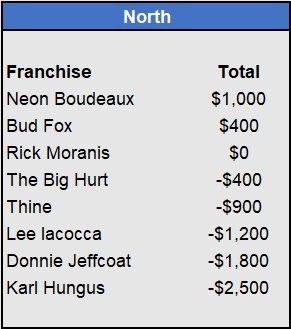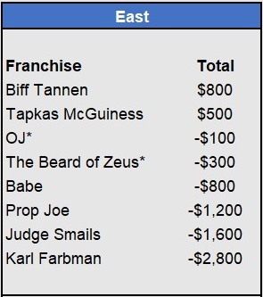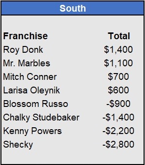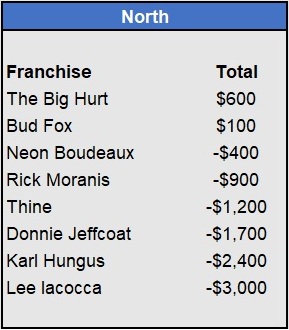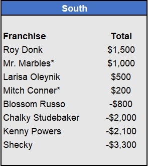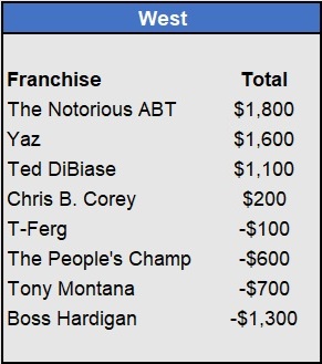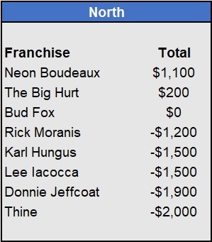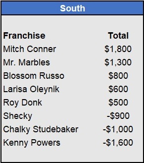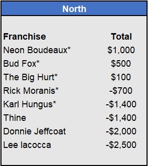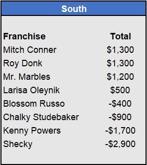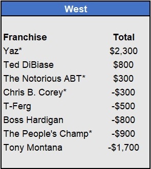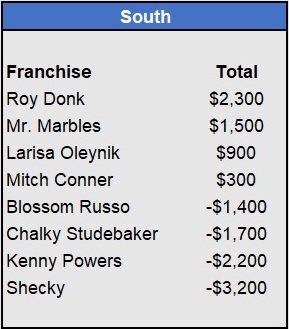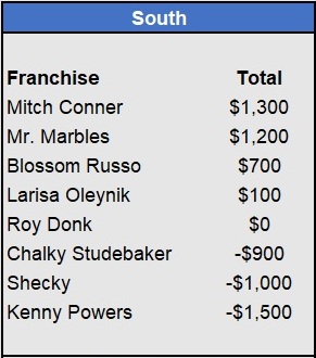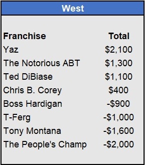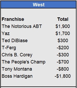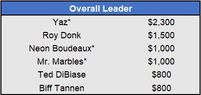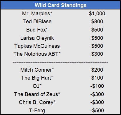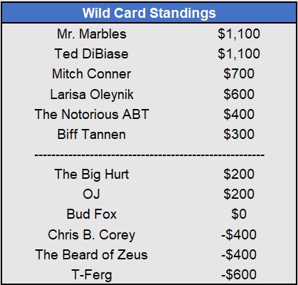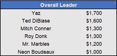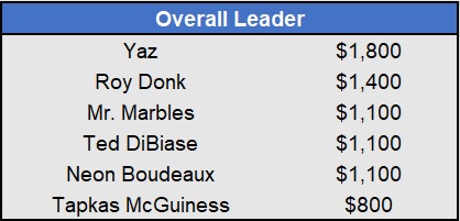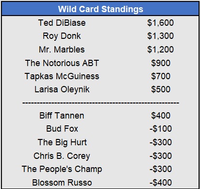 Recap: Larisa Oleynik was perfect again and now enjoys a $600 lead with two weeks to go. Both Tapkas McGuiness and The Notorious ABT won $500 to get within striking distance alongside Biff Tannen. Just three games left to be wagered upon.