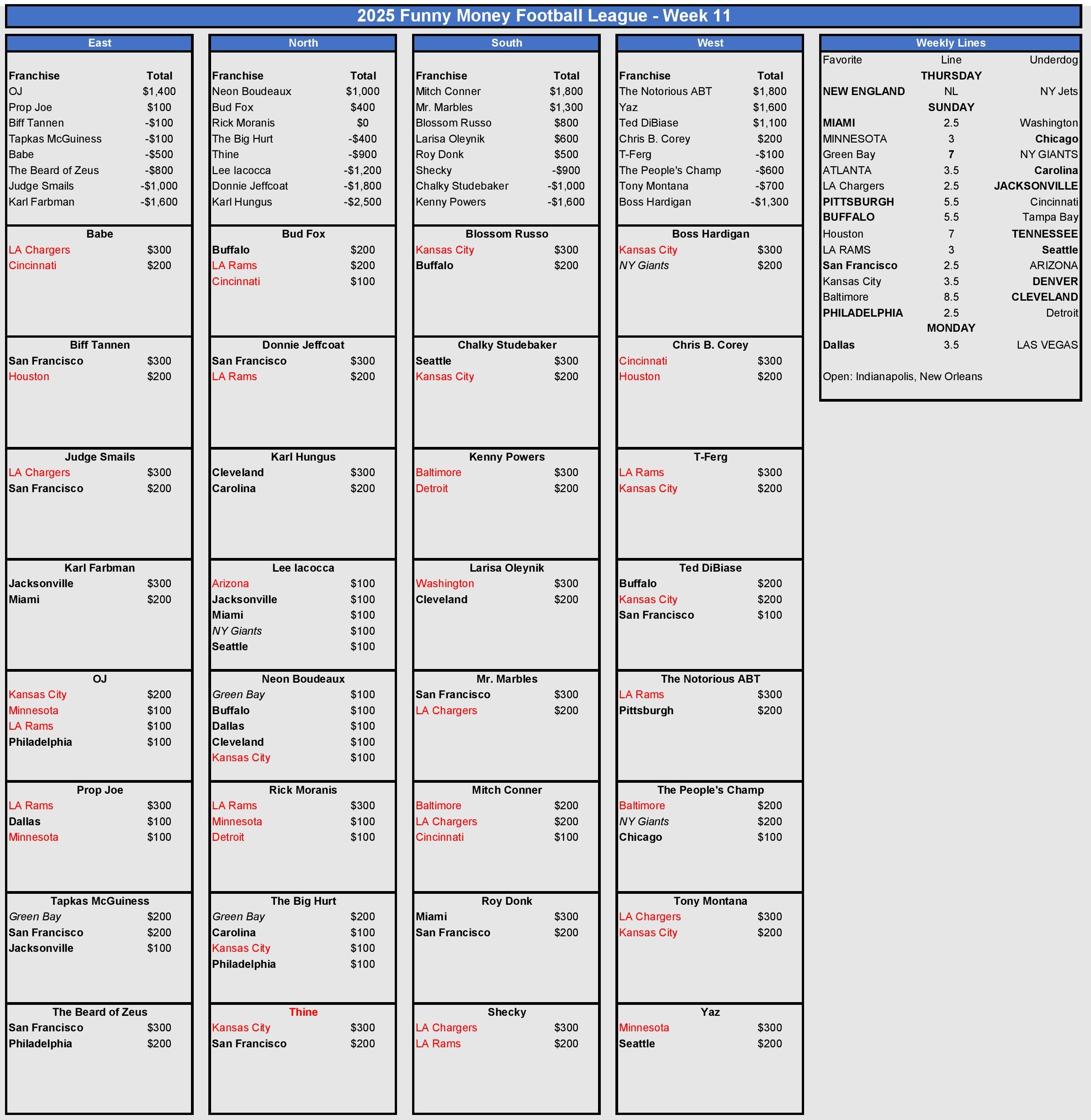 – The league was -$2,500 collectively in Week 11