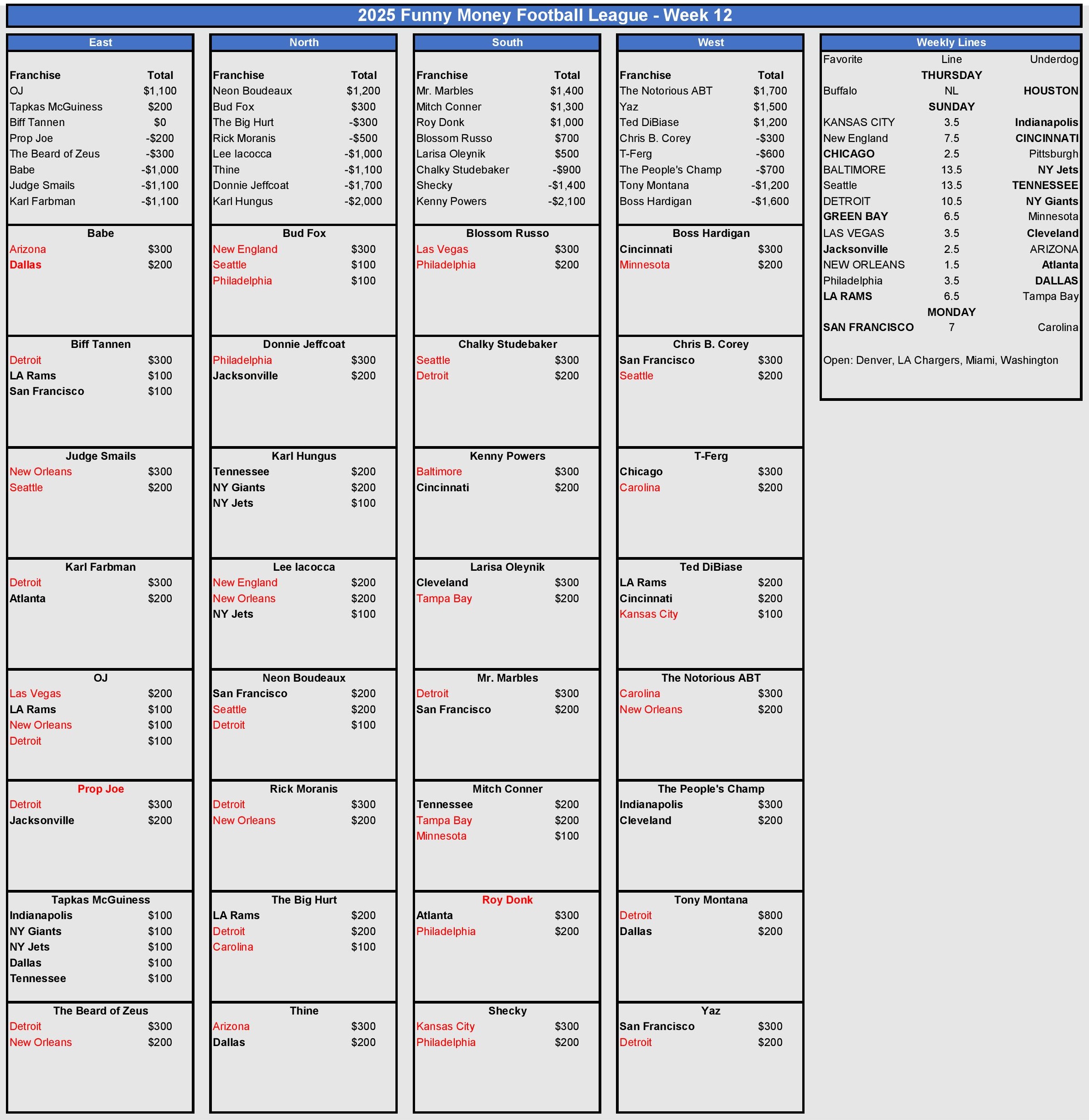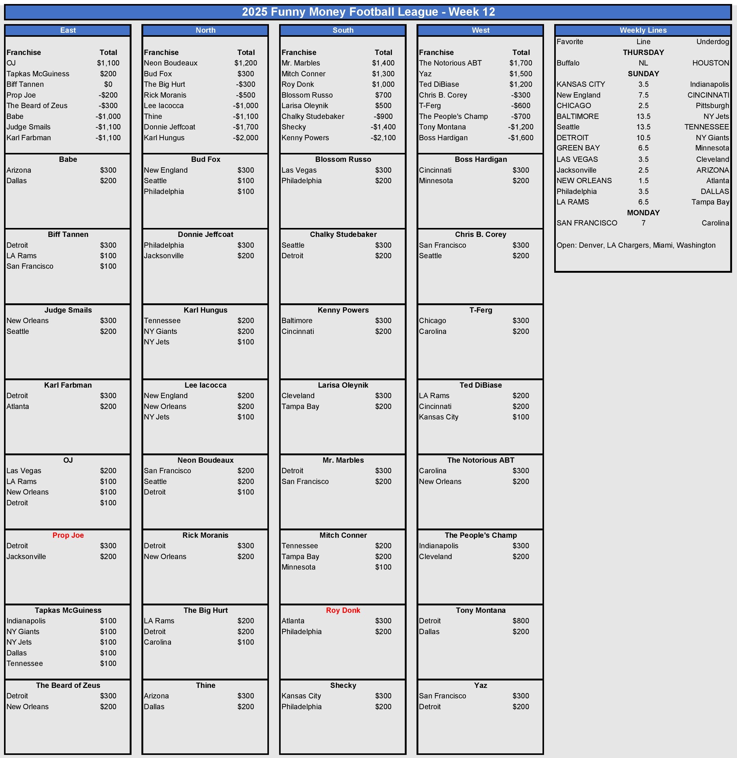 – The league was -$4,100 collectively in Week 12
