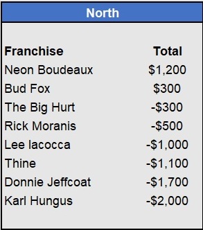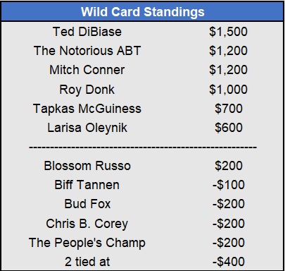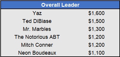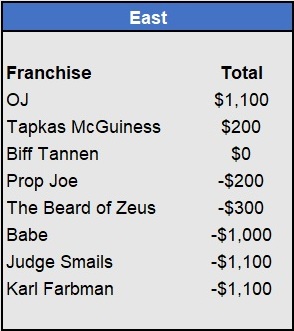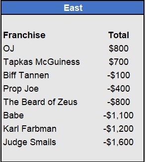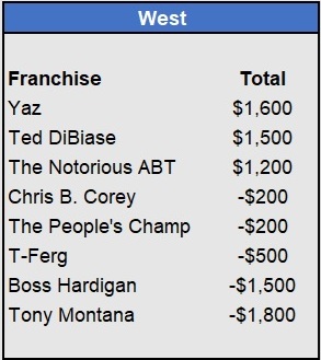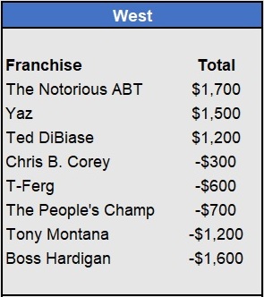 – Tapkas McGuiness closes the gap in the East after a 5-for-5 week (all underdogs). He’s now just $100 behind OJ